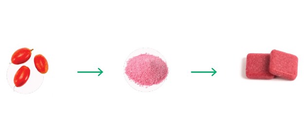The freeze-dried whole berry is a freeze-dried version of the fresh miracle berry. “The berries are frozen to extremely low temperatures and then freeze-dried by extracting water from the berry under freezing temperatures. This allows for the miracle berry to be packaged without any additives or preservatives. It also prolongs the shelf life and allows consumers to carry it around easily. Some of the berries are also converted into powder and compressed into squares without any additives or preservatives (see image regarding the process below). The trademarked MiraBurst Mini Squares have the exact same natural composition as the miracle berry but are packaged as Mini Squares to prolong the shelf life.
