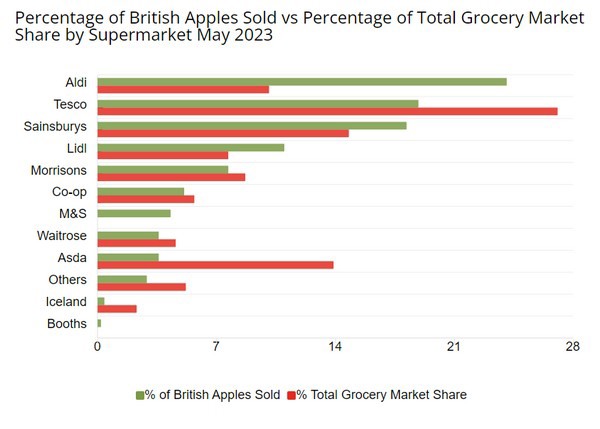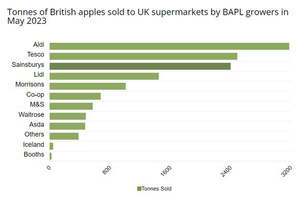 Aldi was still the largest purchaser of British apples sold to UK supermarkets by BAPL growers in May 2023, at approximately 3.200 tonnes sold.