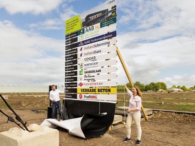 Allison Thomas, Chief Operations Officer, and Dirk Neelis, Chief Financial Officer at Enza Zaden, revealed the construction sign in the company of invited guests and construction partners involved, formally marking the start of construction work on the organic production location.