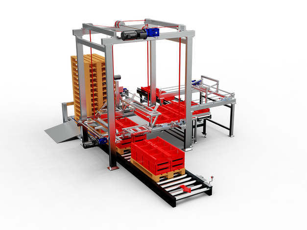 Group 1 is an automatic loading consisting of two devices: A load-pushing machine and a de-stacking machine. Group 2 is an automatic unloading consisting of two devices: A machine that pushes the load and a machine for stacking empty packages. Then there's group 3: an automatic palletizer with pallet storage.
