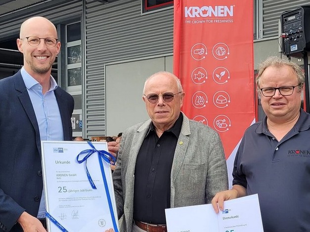 Kronen was originally founded in 1978. In 1998, Zillgith took over the company’s business division of machines for the salad, fruit and vegetable industry and took the helm as its Managing Director. As a result, the company, the headquarters and production facility of which are based in Kehl-Goldscheuer, Germany, has now been owned and managed by the Zillgith family for 25 years. On July 21, in recognition of this special occasion, Alwin Wagner, Deputy Managing Director of the Chamber of Industry and Commerce of the Southern Upper Rhine Area (IHK Südlicher Oberrhein), presented Zillgith with the IHK anniversary certificate and congratulated him on his entrepreneurial foresight and achievements.