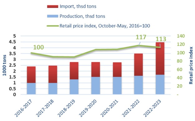 Interestingly, the average retail price for kiwifruit during the active season was reduced by only 3% in the 2022-2023 season compared to the 2021-2022 season and was at the second highest level at least since 2016. Given the increase of about 25-28% in the total supply of kiwifruit in the Georgian market, retail prices reducing by only 3% should be a result of increased demand.