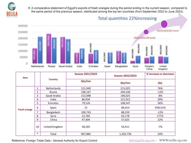The exporter concludes: "At Gelila, we are honored to occupy the fourth place among over 700 Egyptian citrus exporters, with over 40,000 tons exported, 28% more than last year, and growing faster than the national average".