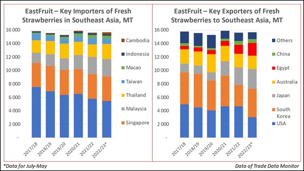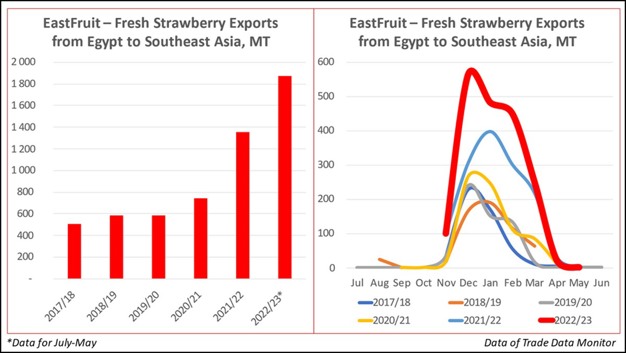 In the first 11 months of the current MY (July 2022 – May 2023), Egypt exported 1,900 tonnes of fresh strawberries to the Southeast Asian market. Given that the Egyptian exports are usually close to zero in June, the final result of the current MY will not change drastically.