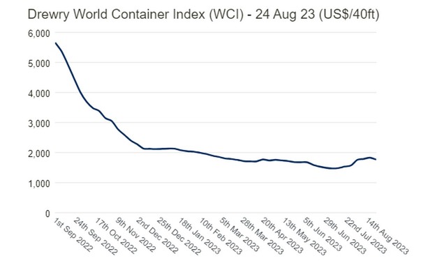 The latest Drewry WCI composite index of $1,768.33 per 40-foot container is now 83% below the peak of $10,377 reached in September 2021. It is 34% lower than the 10-year average of $2,682, indicating a return to more normal prices, but remains 24% higher than average 2019 (pre-pandemic) rates of $1,420.