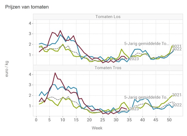 The average price for loose tomatoes fell just below the five-year average in week 34. July and August showed below-average prices more often. In week 34, loose tomatoes recorded 61.5 euro cents. Vine tomatoes went up to 70 euro cents per kilo and remained above the five-year average.
