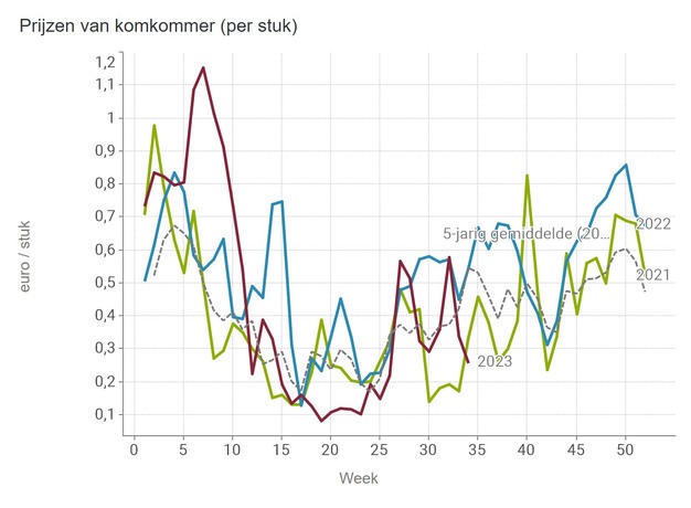 After a very bad spring with cucumber prices far below average for a long time, prices did find their way up from week 25 onwards. In week 27 and week 32, prices even peaked well above the price average for a while but then dropped just as fast again to below the price average. After the peak in week 32, prices fell even more sharply than after the peak in week 27.