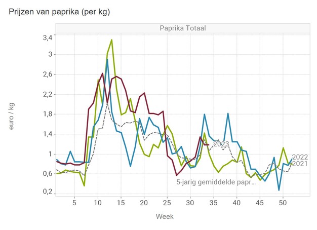 The same goes for the pepper price. Here, the price in week 33 dipped briefly below the five-year average due to the absence of the price peak that was sometimes seen in week 33 in previous years. In week 34 of this year, a kilogram price of over 1.19 euros was realized.