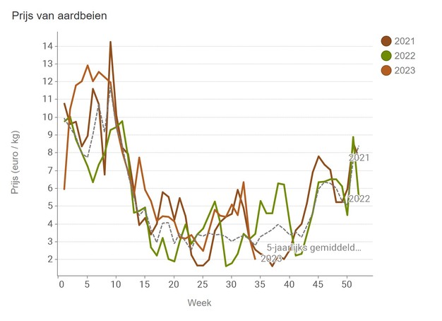 The strawberry price for week 34 came to just over 2.01 euros per kilo. For the first time since week 25, the price here fell below the five-year average again. For quite some time, there was little available, but now the summer crops are up and running.