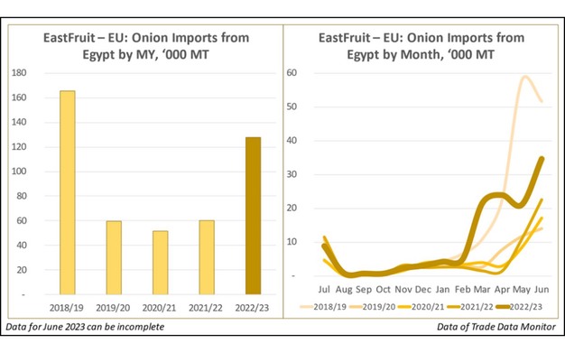 In total, in the period between July 2022 and June 2023, Egypt has shipped 128,000 tonnes of onions to the EU market. For comparison, the Egyptian export volumes did not exceed 60,000 tonnes annually during the previous three marketing years. Nevertheless, current volumes are still lower than a record figure of 165,000 tonnes exported from Egypt to the EU in the MY 2018/19.