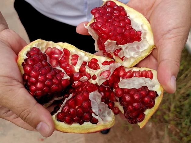 The current progress is going smoothly: "Several new varieties have been bred, which have the advantages of being storage-resistant, seedless, and redder in color. Traditional soft-seeded pomegranates can only be stored for one month after harvest. Otherwise, they will turn black and lose water. However, according to the tests, the new varieties can be stored until March of next year, with a longer shelf life. Secondly, traditional varieties still have seeds, while new varieties can be seedless and have a better taste. Furthermore, conventional soft-seeded pomegranates are colored during the fruit expansion stage, but new varieties have changed color during the fruit-setting. Both appearance and flesh can turn red in a larger area. For example, early-ripening varieties, among the new varieties, achieved 80% coloration of appearance in June. "