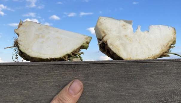 Another variety in the demo field, Prinz F1, does have this hole. Celeriac is increasingly used in meal packages. "A fresh piece of tuber, without a cavity, is highly appreciated," says Ann. Ann points out that celeriac with a cavity sometimes raises questions. "There was once a consumer who sued the supermarket because pests in the supermarket had allegedly gnawed a piece out of the tuber."