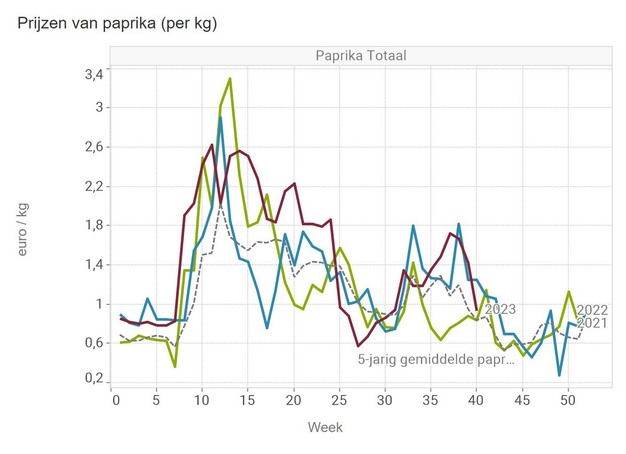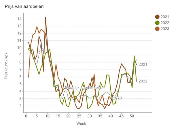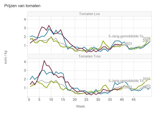 In Belgium, median prices for both loose tomatoes and TOVs rose slightly in week 40. For vine tomatoes, that still means a price that is below the five-year average. This year's prices are no match for those realized in the fall of 2022. Prices for the other large greenhouse crops (cucumber, sweet bell pepper, and strawberry) are also only barely above or even below the five-year average.