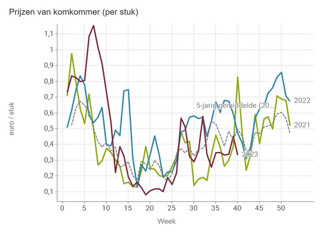 Cucumber average prices sank quite a bit last week, though they are in line with the five-year average and 2022 pricing. There is more and more Spanish product available. With the end of traditional cultivation in the Benelux, prices in Spain shot up last week. On Monday, the unit price there was already €0.70, while the VBT price average for week 40 was €0.334.
