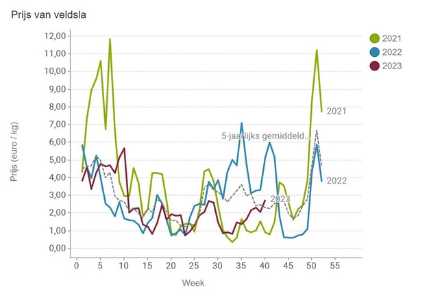 Greenhouse lettuce cultivation has started again, and the head lettuce price drop stopped in week 40. That price rebounded slightly to €0.44/head. It should also be noted that lamb's lettuce prices exceeded the five-year average again for the first time since June.