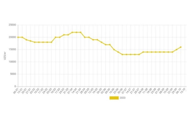 According to EastFruit price monitoring, from September 22 to October 6, 2023, the average wholesale price for bananas in Uzbekistan increased from 14,000 to 16,000 sum/kg (from $1.15 to $1.31), which was the first significant increase in prices for these products over the past 5.5 months. From the third ten days of April to the end of June of this year, wholesale prices for bananas steadily decreased. Then, until the end of the second ten days of September, the average wholesale price remained almost the same level.