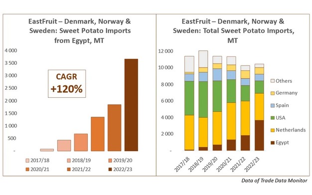 Egypt became the largest supplier of sweet potatoes to Scandinavia, one of the most premium consumer markets in the world, for the first time in history in the MY 2022/23 (July-June), according to EastFruit. Egyptian exporters were able to provide about a third of all sweet potato imports to Denmark, Sweden, and Norway in the past season.