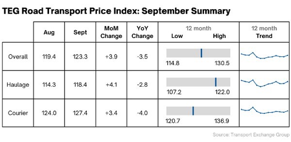 Courier prices increased by 2.7% during September, while haulage prices were up 3.6%. Overall, the index is up 3.3% month on month.
