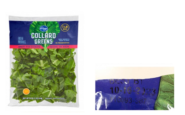 The recalled product,16-ounce bags of Kroger Collard Greens, were sold in the produce department and can be identified as having a UPC code of 11110-18171 with a Best By date of 10-16-2023 and production code 110093-387 (see picture below). All potentially affected products have been removed from store shelves.