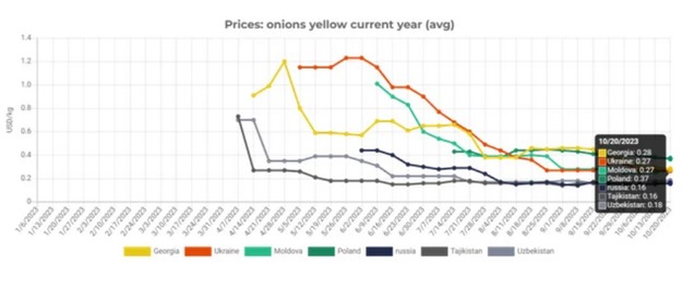 The only country where onions have recently become more expensive is Moldova. Prices here increased by 2 cents per kg, becoming equal to prices in Ukraine. Here, too, exports turned out to be the main factor supporting prices. This year there have been reports of onions being supplied from Moldova to EU countries such as Romania and Austria, as well as to the UK.