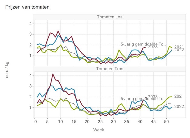 The median price for a kilogram of vine tomatoes increased to just under 2 euros per kilogram last week. This puts the price at a higher level than the already high prices recorded at the same time in 2022. Prices for loose tomatoes are also rising, although not as much.