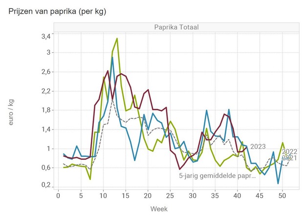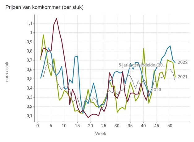 In week 42, near the end of the traditional greenhouse vegetable season, the median price for cucumbers and peppers also went up. For cucumbers, that means a price equal to the five-year average: 37.9 euro cents per piece.