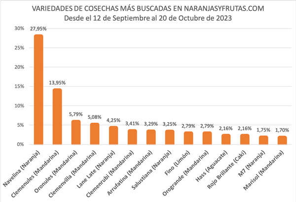 "The most sought-after varieties at this time of the campaign are mandarins, behind Navelina. Specifically, Clemenules stands out with 13.95% of searches, followed by Oronules with 5.79%."