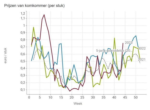 Even for the cucumber price in week 44 at the Federation of Belgian Horticultural Cooperatives, prices are above the five-year average. What's hot? The average price jumped up to 75.7 euro cents each. A very high price for the time of year, when although the lights are back on for some growers, most of the cucumbers still come from southern Europe and North Africa.