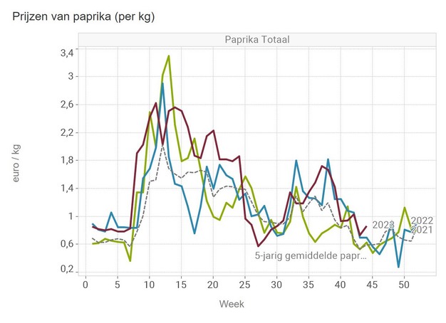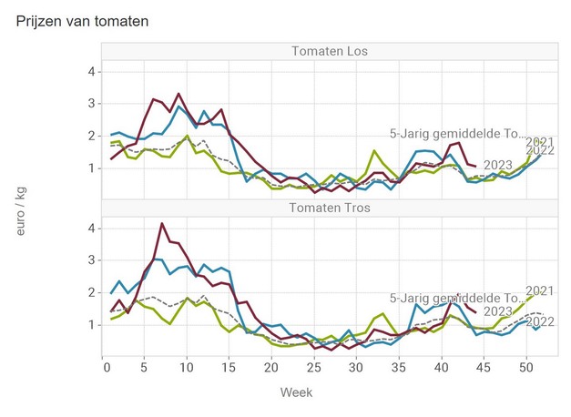 The steep fall in tomato prices slowed last week. The VBT average prices come out at over 1.08 euros for 1 kg of loose tomatoes and just under 1.40 euros for vine tomatoes. With that, prices are still above average and are also higher than in recent years in early November. The same goes for cucumber and pepper.