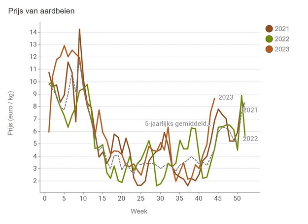Like lettuce, strawberries are also coming out of the greenhouses again. The average price for week 44 comes to 8.69 per kilo. A price last achieved in 2016 in early November. Elsanta is doing even better at over 9.38 euros.