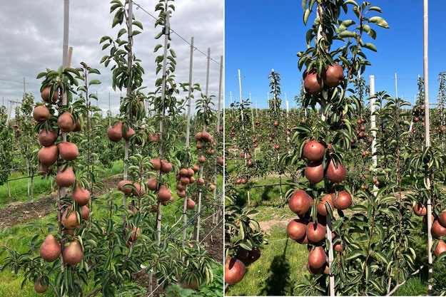 For now, Dutch red Alessia pears are being sold to large German supermarket suppliers and have been in those stores since this month. Kees says there is much interest in this more exclusive pear, especially around the holidays. His first harvest, averaging six kilograms per tree in the first year after planting as a three-year-old cutting tree, was above expectations, and he is well pleased with the pricing. "It's presently covering costs nicely," he concludes.