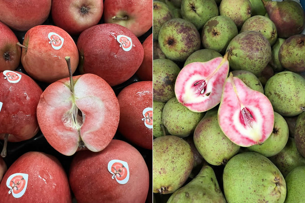 "This red-fleshed, tart apple is perfect for salads or prepared hot. And we, again, have crimson stewing pears available. We, thus, have a nice range of seasonal produce from near and far. We need that combination. We prefer sourcing our products locally, but you can't escape getting them from further away."