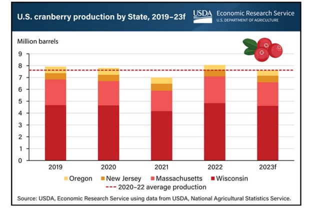 US cranberries are harvested in autumn, just in time for the holiday season. The 2023 US cranberry crop is forecast to be 7.62 million barrels, down 5.4 percent from the previous year, but equal to the 2020–22 average. The top-producing state, Wisconsin, typically harvests around 60 percent of the annual US cranberry crop.