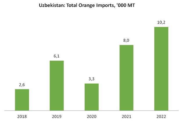The Uzbekistani demand for oranges bounced back after a sharp drop in the year of the coronavirus pandemic, and resumed the upward trend that started in 2019.