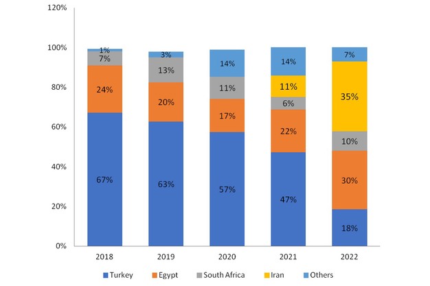 Along with the recovery, the Uzbekistani orange market also underwent significant changes in the composition of its suppliers. Turkey, which used to be the main source of oranges for Uzbekistan, saw its share in this market gradually shrink since 2019, but the most dramatic decline happened in 2021-2022. Even though the total volume of orange imports in Uzbekistan grew almost fourfold from 2018 to 2022, the volume of Turkish orange exports to this market barely changed – from 1.7 thousand to 1.9 thousand tons. As a result, Turkey’s share in the Uzbekistani market plummeted by 3.7 times – from 67% in 2018 to 18% in 2022.