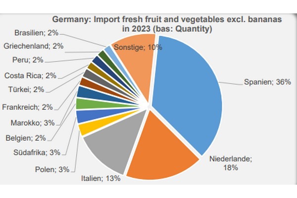 After a sharp drop in Germany's import of fresh fruits and vegetables in 2022, that shrank slightly again this year. In 2023, imports will amount to about 8.38 million tons, compared to 8.54 million last year and 9.2 million tons in 2020 and 2021. This trend can be entirely attributed to fewer imports from Germany's two main suppliers, Spain and the Netherlands.