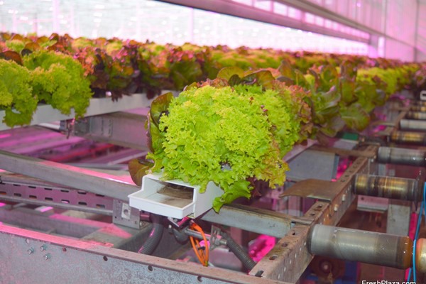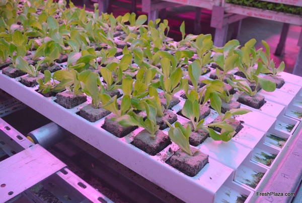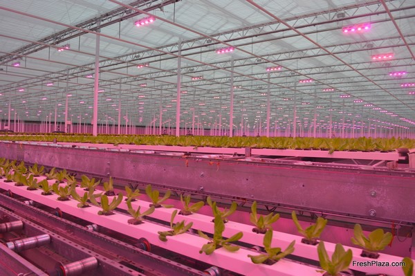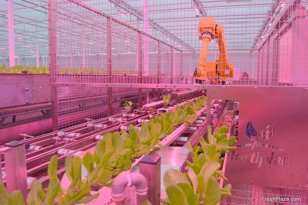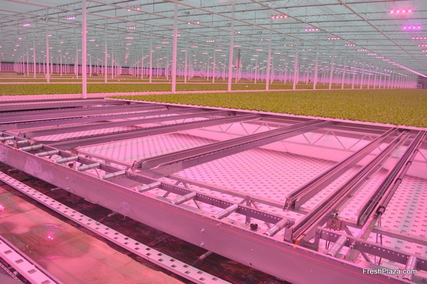 With the help of a robot, salads are transplanted into the larger gutters for the second phase of their growth process.