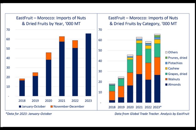 The main surge in imports of this product happened between 2018 and 2021, when the volumes more than tripled. In 2022, due to the slowdown of the global economy, the rise of logistics costs and other economic challenges, Morocco slightly reduced imports of nuts and dried fruits. However, this was only a temporary setback, and by mid-2023, the Moroccan market showed signs of recovery.