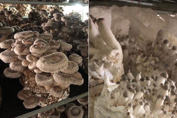 Insights into the in-house organic mushroom cultivation: Shiitake (l) and King Oyster mushrooms (r).