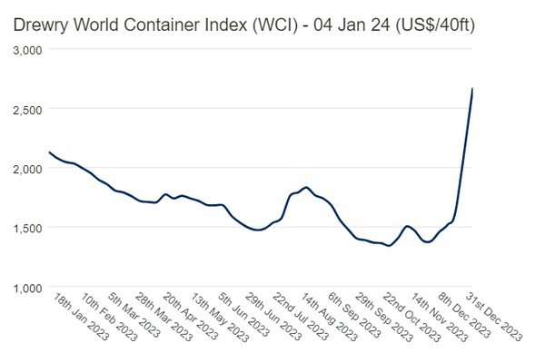 Freight rates on Shanghai to Rotterdam skyrocketed by 115% or $1,910 to $3,577 per feu. Followed by rates on Shanghai to Genoa which rose by 114% or $2,222 to $4,178 per 40ft box. Likewise, rates on Shanghai to Los Angeles elevated by 30% or $626 to $2,726 per 40ft container. Similarly, rates on Shanghai to New York increased by 26% or $784 to $3,858 per feu. Also, rates on Rotterdam to Shanghai jumped by 17% or $80 to $546 per 40ft box. In the same way rates on Rotterdam to New York surged by 2% or $23 to $1,503 per box. While rates on Los Angeles to Shanghai and New York to Rotterdam remain stable. Drewry anticipates East-West spot rates to increase in the coming weeks, due to the Red Sea/Suez situation.