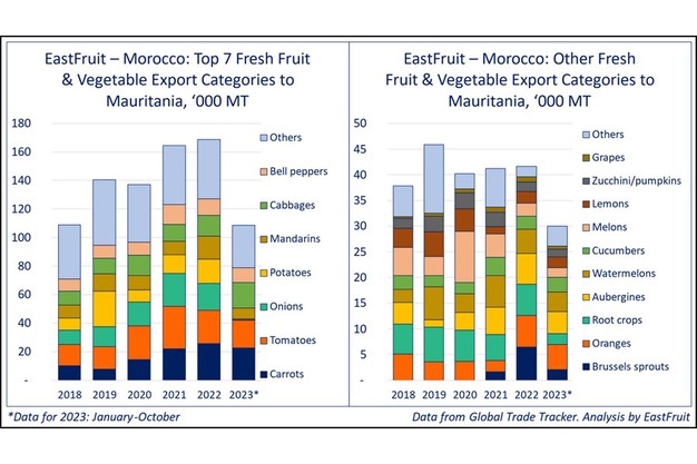 Morocco is a key supplier of fruits and vegetables to Mauritania, with annual exports reaching 170 thousand tons. The main categories of the Moroccan exports include carrots, tomatoes, onions, potatoes, as well as brassica, citrus, cucurbit, and other crops. In many segments, Morocco is the only supplier of fruits and vegetables to the Mauritanian market, as production in other Sahel countries is not sufficiently developed for considerable export.