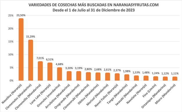 Midway through the 2023/24 citrus season, Naranjasyfrutas.com, the leader in Spain for online horticultural marketing, has shared the search trends by wholesale businesses purchasing such crops from producers. The results are displayed in the following graph, where the Navelina and Clemenules stand out among the varieties most in demand by businesses: