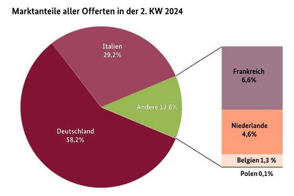 Domestic offers dominated the apple market: Elstar, Jonagold, Boskoop, and Wellant were predominant. Pink Lady, Granny Smith, and Red Delicious were primarily sourced from Italy. France mainly contributed with Pink Lady and Jazz. Dutch shipments completed the range of goods. Jonagold-Decosta from Belgium appeared: the striped and dark red fruits were sold in Frankfurt for €0.90 per kg. Polish Idared sized 80/90 mm were also available there, costing only €1.08 per kg.