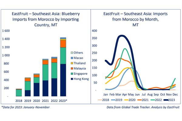 Morocco continued to consolidate its position in the fresh blueberry market in Southeast Asia in 2023, reports EastFruit. Moroccan blueberry exporters not only broke their previous record of shipments to this region, but also expanded the number of countries that import their berries.