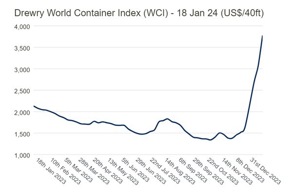 The latest Drewry WCI composite index of $3,777 per 40ft container is the highest since October 2022 and is 166% more than average 2019 (pre-pandemic) rates of $1,420.