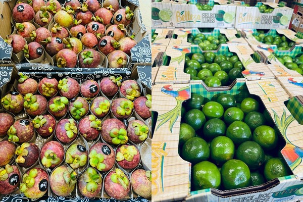 Mangosteen from Colombia (l) and Tahiti limes from Brazil. In summer, Se-Sa also trades Persian limes.