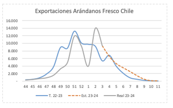 "Chilean fresh blueberry exports peaked and the export volumes were above estimates. Weekly volumes should decrease from week 4-2024," he said.