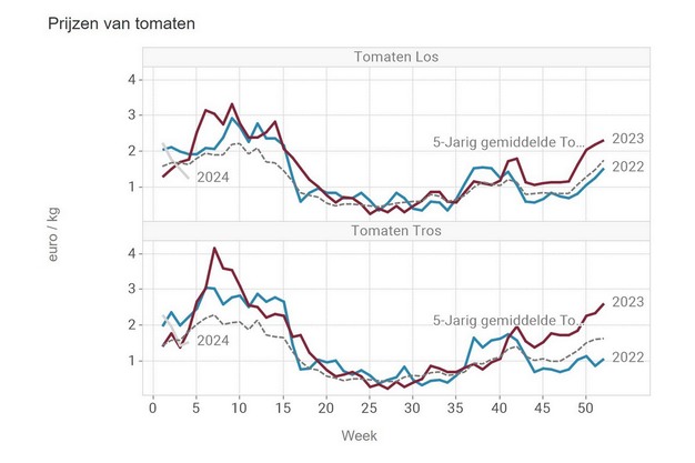 Last week, the prices for cucumbers and loose tomatoes continued to drop. However, the average price of tomatoes on the vine showed a slight rebound, according to figures from the VBT.