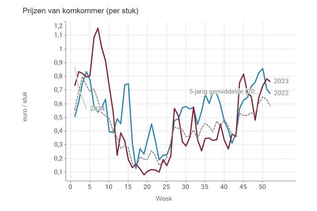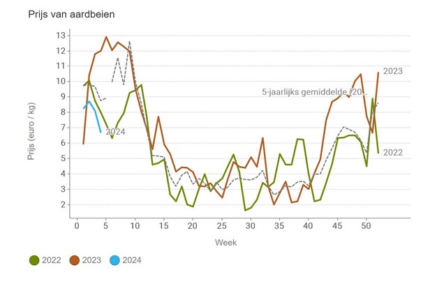 Lettuce and lamb's lettuce have escaped these negative trends. The average price of lettuce is in line with the rising price trend of 2023. The average price for lamb's lettuce is much higher, although the peak was already reached in the previous week.