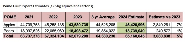 The pear export estimate on the other hand indicates a more moderate outlook with a volume increase of 1% on last season’s volumes. Abate Fetel volumes are expected to decrease by -3% due to the earlier harvest and some frost damage. Packham’s Triumph volumes are anticipated to remain the same as last season whereas the summer blushed pears such as Cheeky, Celina and Rosemarie are expected to slightly increase.